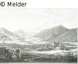 In einer bergigen Landschaft das Kloster Heindorf. Im Vordergrund sind Staffagefiguren zu sehen und auf einem Weg ein Hirte mit seiner Herde, weiterhin Wiesen, Häuser und Bäume, nach Albert Zimmermann