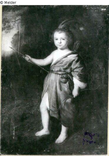 (vielleicht später Kopie) Stehender Knabe nach halblinks, in rötlichem Gewand, mit Pfeil und Bogen, den Köcher auf Rücken, auf dem Kopf Federschmuck; im Hintergrund Waldlandschaft.