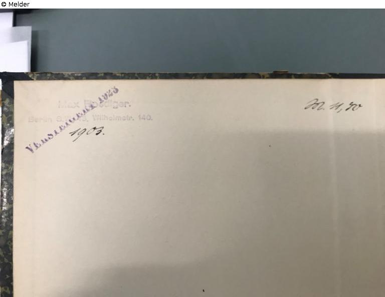 Stempel: auf dem Vorsatzspiegel o. l. in Blau: Max Roediger | Berlin S. W. 48, Wilhelmstr. 140; mit Feder in Schwarz: 1903 [Erscheinungsjahr]; über den Besitzstempel gestempelt in Blau: Versteigert 1923