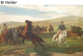 Fundmeldung | Einzelobjekt Kosaken beim Pferdefang Lost Art-ID582924 Vorherige Weiter Hersteller/Künstler:in Steffeck, Carl Constantin Heinrich Geburt 1818.04.04, Berlin Tod 1890.07.11, Königsberg WirkungsortBerlin; Königsberg TitelKosaken beim PferdefangObjektartGemäldeObjektgruppeMalereiMaterial / TechnikÖl ; Leinwand / gemalt Höhe 109,00 cm Breite 169,00 cm Tiefe 0,20 cm Inventarnummermü10662Bestand Kulturgüter aus dem ehemaligen ReichsvermögenVeröffentlicht seit26.04.2019 Kontakt Kunstverwaltung des Bundes Herbert-Bayer-Straße 5 13086 Berlin Deutschland E-Mailprovenienzforschung@kvdb.bund.deHomepagehttp://www.kunstverwaltung.bund.de