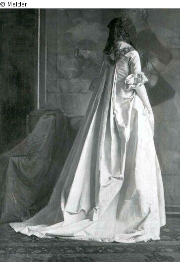 Signatur: C.Gussow.Weimar.64; Dame in Rückenansicht mit langem Kleid und dunklem Tuch über Kopf. Links liegender, drapierter Stoff. Hinten Gemälde Friedrich der Große (teilweise verdeckt).