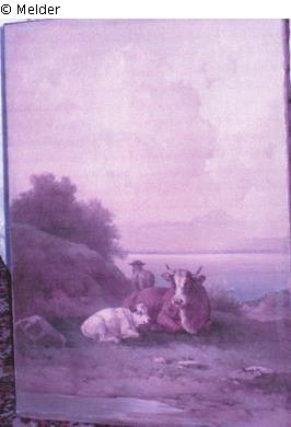 In der Bildmitte eine liegende Kuh mit Kalb, dahinter ein Schaf von hinten. Im Hintergrund ein See mit Bergen in der Ferne. Vordergrund saftige Wiese, Fels links mit Gebüsch.