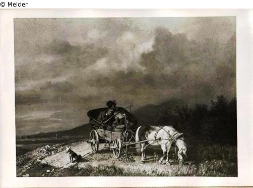 Gewundener Feldweg mit kleinem Abhang nach rechts von der Kutsche. Die Kutsche haltend mit zwei angetrunkenen Bauern. Rechts in Fahrtrichtung ein Hund sitzend, das Pferd grasend.