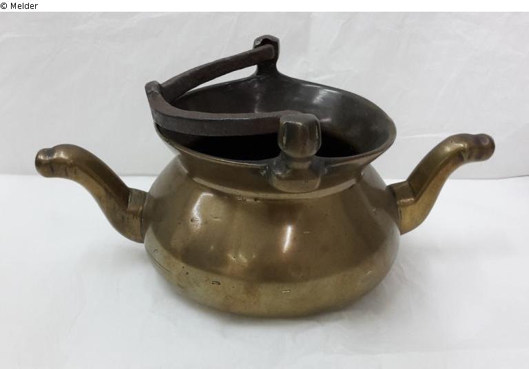 Norddeutscher Lavabokessel aus Messing mit zwei Ausgüssen und eisernem Henkel, die Enden der Ausgüsse sind Tierköpfen ähnlich gestaltet. Er diente im sakralen Bereich für liturgische Waschungen.