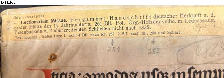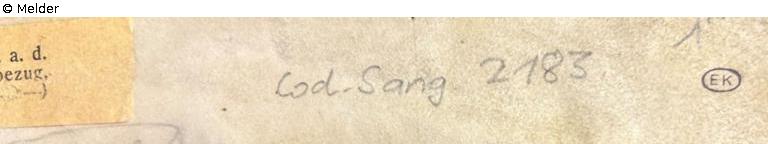 Auf Fol. 1: Stempel "EK" in Ellypse, handschriftlich in Bleistift "Cod. Sang. 2183", aufgeklebter Zettel aus Auktionskatalog Karl-und-Faber-Kunst- und -Literaturantiquariat