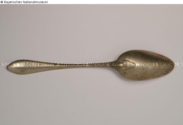 Befund: Auf der Unterseite der Laffe: Meisterzeichen 'LR in Rechteck', für Lukas Römer (Meister 1780, gest. 1816); Beschauzeichen 'Pyr über W in Hochoval', für Augsburg, 1811-1812. Auf der Unterseite des Griffs: Firmenzeichen 'SEETHALER in Querrechteck', für Johann Alois Seethaler (Meister 1796, gest. 1835); handschriftlich mit weißer Farbe "40/109" (Inv.-Nr. des Bayerischen Nationalmuseums). Auf der Oberseite des Griffs: handschriftlich mit schwarzer Farbe: "1884" = Nummer der Ankaufsstelle des Städtischen Leihamts München ("Verkauf von Kunst- und Seltenheitswerten an das Bay[erische] Nationalmuseum München, aus dem Bestand von j[üdischen] Silber-Gegenständen", vom 01.10.1940; BNM-Dok. 200)./A.G., 2018