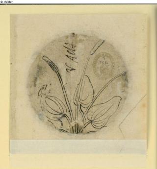 verso: Zeichnung zu einem Breitwegerich /Großwegerich (Plantago major) mit Blättern und zwei Blütenständen; über dem linken Blatt in Tinte: „16“ [oder „id“ oder „18“]; zwischen den Blütendolden in Tinte: „W ActA“ [oder „A etA“ [Lesart unsicher]; rechts neben der Blütendolde Stempel SGSM 17/Lugt 1094b.
