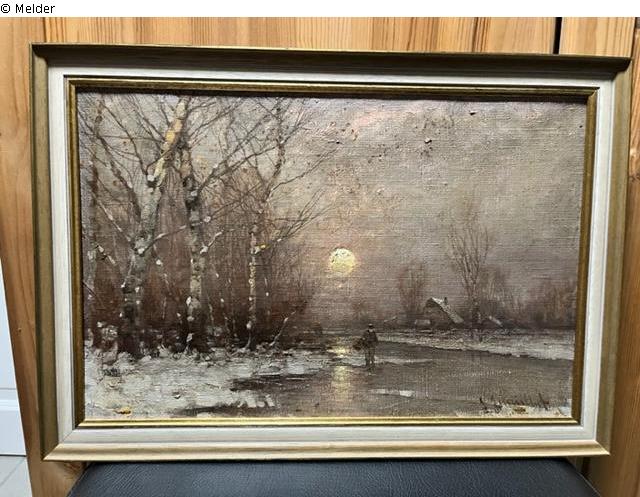 Die Darstellung zeigt eine Winterlandschaft mit zugefrorenem Fluss, einem Birkenwäldchen auf der linken Bildseite und schneebedeckten Häusern im rechten Bildhintergrund. Auf dem Fluss ein Spaziergändger dem Betrachter entgegenkommend.