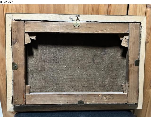 Rückseite: Name des Künstlers (falsch geschrieben, mit schwarzem Stift); 413/28320, Gl, (mit schwarzem Stift); Stempel, mutmaßlich Galerie bzw. Aktionshaus: Robert - mbusch, Düsseldorf