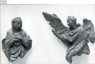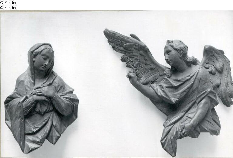 Holz, ungefaßt, Halbfigur; Kopf nach halbrechts geneigt, Hände über der Brust zusammengelegt. Gehört zu Inventarnummer (mü2434/14) Engel einer Verkündigung.