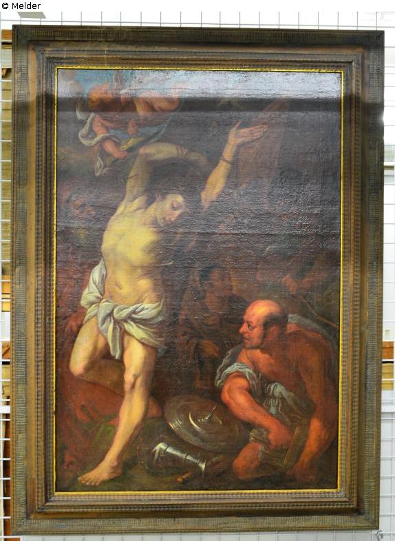 Im Zentrum der jugendliche Sebastian mit Lendenschurz. Er ist an einen Baum gebunden und hat Pfeile in Brust und Armen. Seitlich mehrere Bogenschützen, die mit Pfeilen auf ihn schießen. Links oben ein Putto mit dem Palmzweig.