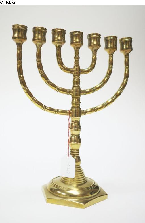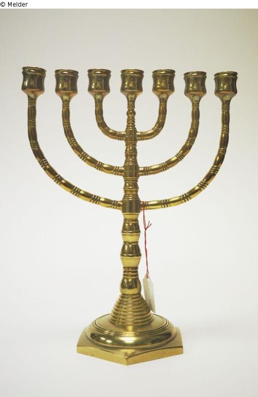 Es ist ein Kerzenständer mit sieben Armen, und bekanntlich eines der meistgenutzten Symbole des Judentums. Diese aus Messing gefertigte Menorah hat einen sechseckigen ansteigenden Sockel mit 11,2 cm Durchmesser, auf dem ein rund getreppter Balusterschaft die Arme des Leuchters trägt. Die Höhe des Leuchters ist 26,5 cm und die Breite 21 cm. Der Leuchter ist leicht beschädigt und zu einer Seite verbogen.