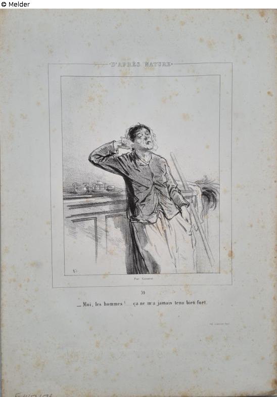 Recto: o.r. in Blei "X", o.m. im Stein "D' APRÈS NATURE", u.l. "8c", u.m. "Par Garvani", "39", "Moi, les Hommes!....ca ne m'a jamais tenue bien fort.", "Imp Lemercier, Paris", u.l. in Blei Inv.nr. "VI b/52/516"; Verso: u.l. in Blei "D", "49920", u.r. in Blei "47/2259", Stempel in Blau "Städt. Museum Zeitz".