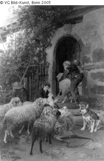 Fundmeldung | Einzelobjekt Mutterschafe kommen in den Stall Lost Art-ID565767 Vorherige Weiter Hersteller/Künstler:in Zügel, Heinrich von Geburt 1850.10.22, Murrhardt Tod 1941.01.30, München WirkungsortStuttgart; München TitelMutterschafe kommen in den StallObjektartGemäldeObjektgruppeMalereiMaterial / TechnikÖl ; Leinwand / gemalt Höhe 68,00 cm Breite 46,50 cm Inventarnummermü3693Beschreibung Signatur: H. Zügel, München; Hirt und Hirtenbub mit Schafherde vor einer Haustür. Haustür schräng in der Mitte, links Garten. Alter mit Schaf (in Rückenansicht) in der halbgeöffneten Tür. Vor den Stufen rechts sitzender Hund, links Herde und Junge. Weiterlesen Weniger anzeigen Bestand Kulturgüter aus dem ehemaligen ReichsvermögenVeröffentlicht seit13.12.2016 Kontakt Kunstverwaltung des Bundes Herbert-Bayer-Straße 5 13086 Berlin Deutschland E-Mailprovenienzforschung@kvdb.bund.deHomepagehttp://www.kunstverwaltung.bund.de