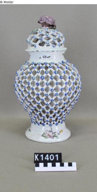 Netz mit plastischen blau-gelben Blümchen; Hals und Fuß ohne Netz mit Blumenornamenten in den Farben Gelb, Mangan, Blau, Grün. Auf dem Netz des Deckels eine plastische manganfarbene Rose mit blau-grünen Blättern und braunem Stiel. Kleine angestoßene Stelle. Marke E K.