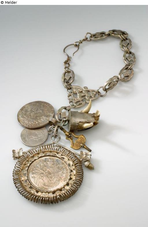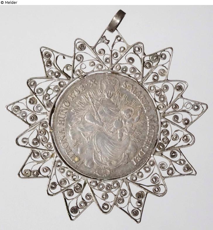 Geschnüranhänger in Form eines silbernen Madonnentalers in sternförmiger Silberfiligranfassung mit Voluten und Rollwerk. Auf der Vorderseite sitzende Maria mit Kind, Krone und Zepter, einen Fuß auf die Mondsichel setzend, in ihrer Funktion als Patronin Ungarns, Datierung 1782. Auf der Rückseite halten zwei Engel die geflügelte Stephanskrone über das ungarische Wappen Josephs II., umgeben von einer Ordenskette.