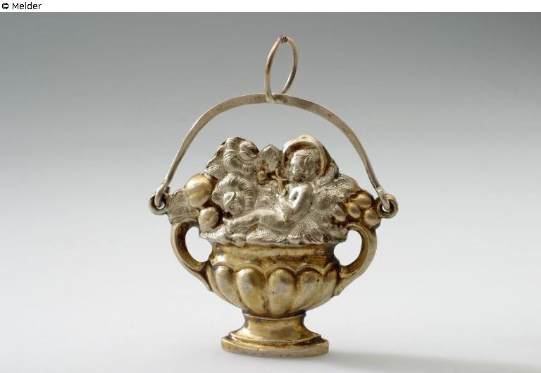 Aus zwei Teilen gepresst und zusammengelötet. Doppelhenkeliges gefußtes Gefäß, darin Rosen und Früchte zwischen denen das Christkind mit Kreuz in der Hand liegt. Beweglicher Bügel mit Ring. Am Henkel Feingehaltstempel 13.