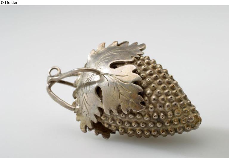 Spitzovale Traube mit symmetrisch gereihten Beeren, oben aufgelegt zwei ausgeschnittene gravierte Blätter, darüber gebogener Stiel mit zwei Bügeln. Am Stil Beschauzeichen Rosenberg Bd. II, 2184 und Feingehaltstempel 12.
