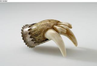 Raubtiergebiss (Marder oder Iltis), Oberkiefer mit zwei Fangzähnen, zylindrische Silberfassung. Steg mit Lambrequin-Borte, unten als Zunge bis an die Zähne reichend; gezackte Platte mit Aufhänger.