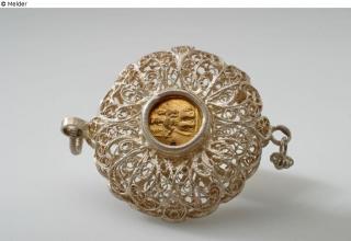 In der Mitte Zylinder, der jeweils durch kleines vergoldetes Medaillon mit sitzender Maria mit Kind verschlossen ist. Breiter doppelseitiger Filigranrand, dessen gebogte Außenkanten miteinander verbunden sind. Oben und unten je ein Ring, am unteren kleiner Anhänger.
