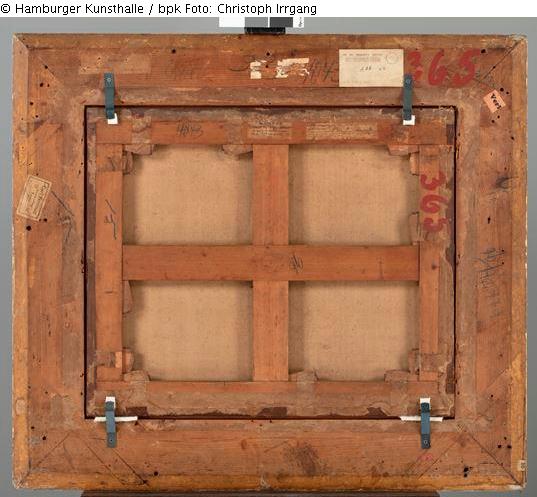 15) unten links, Bleistiftkringel, von Bedeutung?; 16) links, mittig, blaue Ölkreide: „15“ [= siehe 4)]; 17) links, mittig, Aufkleber, weiß in schwarzem Kasten: [1. Zeile (mittig):] „Carl Hommel“, [ 2. Zeile (mittig):] „Kunsthandlung“, [3. Zeile (rechtsbündig):] „Frankfurt a.M.“, [4. Zeile (mittig unter Zeile 3):] „Kaiserstrasse 28.“, [5. Zeile (linksbündig):] „No“ sowie „handschriftliche Annotation: „35“, unten rechts außerdem mit Bleistift hinzugefügt: „600“