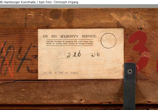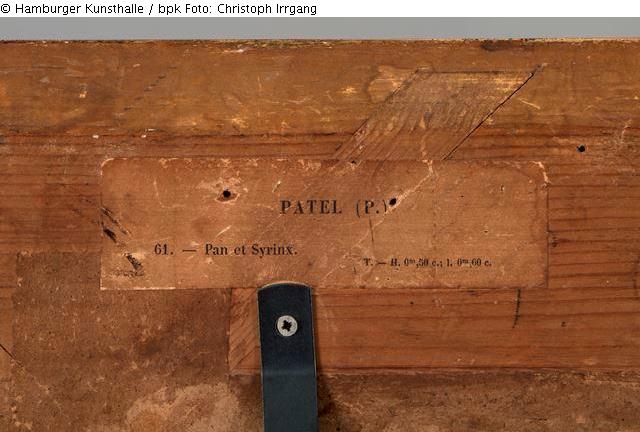 8) rechts neben 7), blaue Ölkreide: „96“ [= …] Zierrahmen: 1) links oben, Aufkleber, weiß mit schwarzer Schrift, darauf: [1. Zeile (mittig):] „Patel (P.)“, [2. Zeile (linksbündig):] „61. – Pan et Syrinx“, [3. Zeile (rechtsbündig):] „T. – H. 0m,50 c.; L. 0m,60c.“; 2) mit Bleistift und teilweise überlagert von 1): „P[? überklebt] Patel“; 3) oben mittig, unleserlicher Schriftzug in schwarzer Öl-Kreide und überlagert von 4); 4) Klebereste eines Aufklebers; 5) oben mittig, rote Ölkreide: „15“ [= siehe 4)]; 6) oben mittig, blaue Ölkreide und teilweise überlagert von 5): „4043“ [= Siehe 1) bei Werkrückseite]; 7) oben mittig, rechts, weißer Aufkleber, rechteckig, in schwarzer Schrift, darauf: [1. Zeile:] „ON HIS MAJESTY´S SERVICE“, [Eingerahmt in zwei längs verlaufende Striche: [2. Zeile:] „FASTEN Envelope by gumming this Label across Flap.”, [3. Zeile:] “OPEN by cutting Label instead von tearing Envelope.”, Rechts daneben befindet sich ein schwarzer Kreis, unten links, linksbündig: „Ppt. Ltd. Wt. 57691 4/45 (Lablest)“; 8) oben rechts, rote Farbe/Lack: „365“ [= siehe 5) bei Werkrückseite]; 9) oben rechts, unleserlicher Schriftzug in blauer Ölkreide und überlagert von 8); 10) rechts, leicht rötlicher Aufkleber, abgerissen an der rechten Seite: „verk[ „k“ nur zur Hälfte]; 11) mittig, rechts, schwarzer Graphit o. Bleistift, überlagert von 12), lesen wir momentan als: „70“; 12) mittig, rechts, blaue Ölkreide: „A 2237-96“; 13) unten rechts, Aufkleber, weiß, gezahnt, schwarzer Strich am oberen Rand, Reste eines schwarzen Strichs am linken und rechten Rand zu erkennen, in schwarzer: „96“; 14) unten rechts, rötlicher Aufkleber, gezahnt, handschriftlich, Tinte/Tusche: „2“