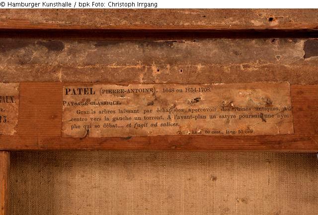 Verso: Werkrückseite: 1) oben links, blaue Ölkreide: „4043“ [= KONTEXT Schlüter]; 2) oben mittig, weißer Aufkleber mit schwarzer Schrift, beschädigt und oberer Teil überklebt, darauf: [1. Zeile:] “MOMPER“, [2. Zeile:] „RENTOILEUR DES MUSÉES IMPÉRIAUX.“ [3. Zeile:] „11, Rue des Marais-St-Germain.“, [4. Zeile:] „Ateliers, 13, Rue de la Sablière, 13.“, [5. Zeile:] „Paris.“; 3) oben rechts mittig, weißer Aufkleber mit schwarzer Schrift, beschädigt, darauf: [1. Zeile:] „Patel (Pierre-Antoine“. 1648 ou 1654-1708.“, [2. Zeile:] „Paysage Classique.“, [3. Zeile:] „Grands arbres laissant par échappées apercevoir des Ruines antiques. Au“, [4. Zeile:] „centre vers la gauche un torrent. A l’avant-plan un satyre poursuit une nym-“, [5. Zeile:] „phe qui se débat…. Et fugit ad salices.“, [6. Zeile:] „Toile, haut 60 cent., larg. 50 cent.“ ; 4) mittig auf Holzkreuz, rote Kreide: „15“ [= mglw. Verweis auf die Tafelnummer, die das Werk in der Auktion Künstlerische Wohnungseinrichtung eines bekannten Großindustriellen, Auktionshaus Edgar Joseph u. Rudolf Preuss, 21.-22.10., Berlin-Charlottenburg, 1929, erhalten hat.]; 5) rechts, rote Farbe/Lack: „365“ [= Nummer des Werks in der Liste Schlüter]; 6) links, blaue Ölkreide: „15“ [= siehe 4)]; 7) mittig auf Holzkreuz, Abdruck eines Prägestempels, rund: „Momper A Paris“