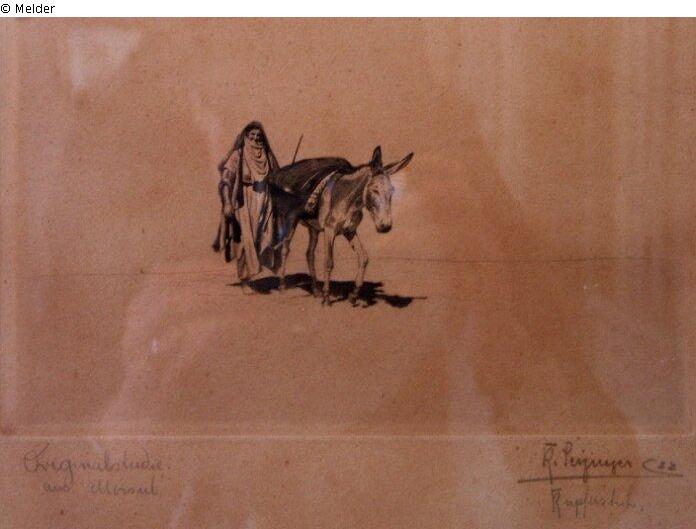 Wüstenlandschaft mit weiblicher Figur und Esel; signiert "R. Seizinger 22 Kupferstich"; Künstlerbezeichnung lt. Meldung: "Leizinger R. ?"; Aufschrift links unten: "Originalstudie aus Mossul"