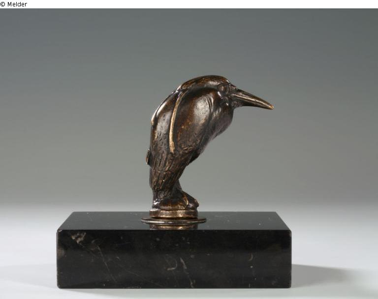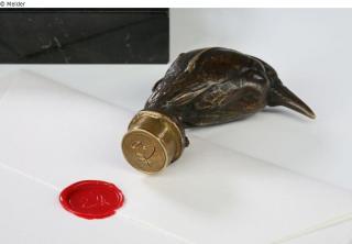 Alternative Bezeichnungen: "Petschaft Rabe"; "Rabenpetschaft“ / Siegelabdruck: Initialen, Auflösung unklar, s. Abb.; Auf dem Sockel Etikett Cassirer: "No. 5149/ Gaul/ Rabenpetschaft". 1902 Ausstellung eines Reihers als Petschaftsgriff in der Galerie Paul Cassirer, Berlin (Werkidentität unklar); 1904-1919 Verkäufe von ca. 14 bis 15 Güssen über Paul Cassirer, Kunstsalon Cassirer, Berlin; nach 1921 weitere Verkäufe von Nachgüssen, autorisiert durch das Nachlass-Kuratorium, über Paul Cassirer, Berlin. Nach 1930 Verkauf von Teilen des künstlerischen Nachlasses an Dr. Paul Geipel, Dresden, der zuvor auch schon Exemplare über Cassirer erworben haben soll, aber in den Geschäftsbüchern nicht nachweisbar ist. Im Museum der bildenden Künste, Leipzig, sind noch zwei weitere Exemplare aus der Sammlung von Paul Geipel nachweisbar, die nicht mit dem Exemplar im NLMH in Zusammenhang stehen können.