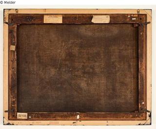 [rechter Keilrahmenschenkel u.:] Reste eines weiß-rosa farbigen Aufklebers [linker Keilrahmenschenkel o.:] quadratischer Aufkleber mit rundem Prägestempel [Adler mit flatternden Flügeln auf (Wappen-?) Schild stehend], im Kreisrund Beschriftung: Dogana…138 [daneben handschriftlich in blauer Kreide:] 21101/1
