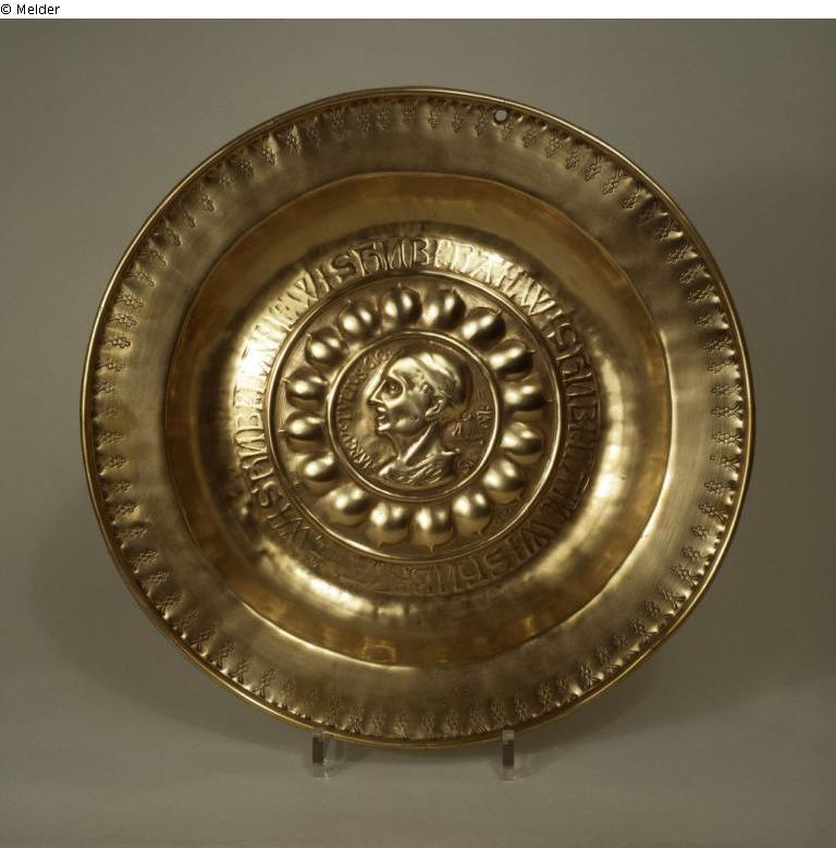 Messingplatte mit breitem, flachem Rand, im Spiegel antikisierender Kopf "Marcus Tullius Cicero", Blätter und Schriftband, Aufhänger. Markierungen in schwarzer Schrift auf der Objektunterseite: "366", "1525"