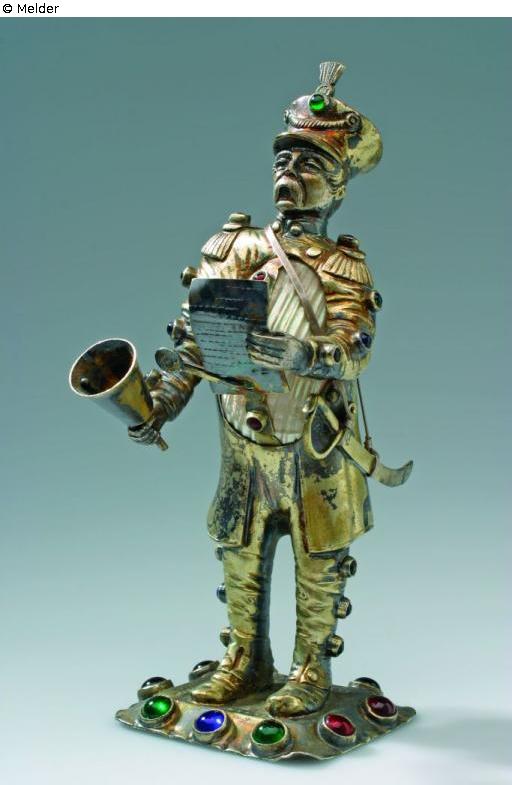 Treibarbeit. Auf rechteckigem niederem Sockel mit angedeutetem Naturboden und flach abgeschrägtem Rand vollplastische Figur mit gegrätschten, etwas krummen Beinen stehend. Oberkörper aus perlmuttfarbenem Muschel- oder Schneckengehäuse. Vermutlich ein Polizeidiener oder eine Person mit militärischem Bezug. Der Blick ist auf ein Blatt mit anhängendem Siegel gerichtet, das in der Linken gehalten wird, der Mund ist zum Sprechen geöffnet. Die abwärts gerichtete Rechte hält eine große Glocke schräg nach oben.