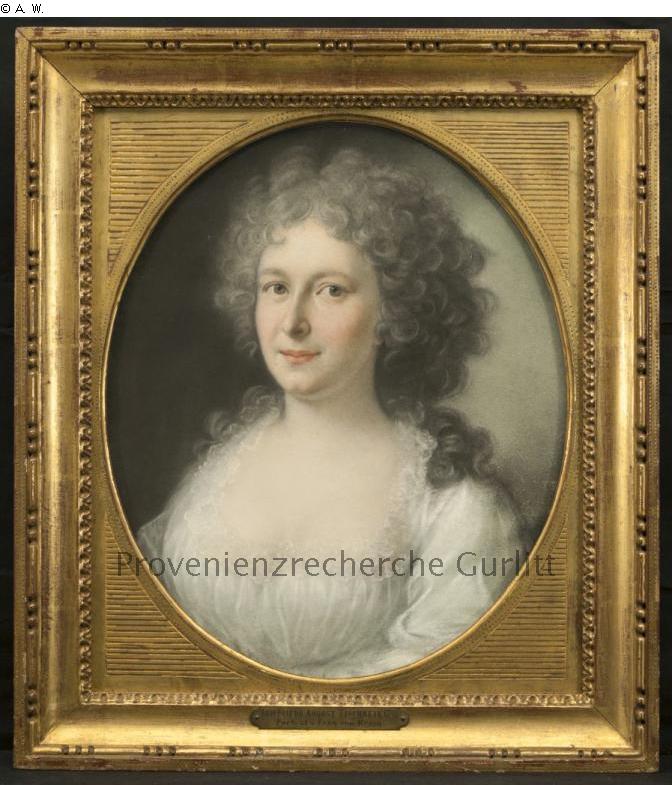 Zierrahmen: recto, unten mittig Metallplakette, geprägt: „JOH. FRIEDR. AUGUST TISCHBEIN 1792 / Porträt v. Frau von Krain”; Zierrahmenplatzhalter: verso, in Bleistift: „L OH“; Passepartoutrückkarton (alt): verso, oben rechts, in Bleistift: „900.-“, „K V H / 1287“, „B A A[?]“; verso, unten rechts, in Rot: „[unlesbar]“; Passepartoutrückkarton (neu): verso, unten rechts, rechteckiges Etikett: „Kunst- und Ausstellungshalle / der Bundesrepublik Deutschland GmbH / Reg.-Nr. 1191 / Johann Friedrich August Tischbein / Damenportrait, 1792“; Rückwandkarton: verso, oben rechts, kreisrundes Etikett mit gezacktem Rand, beschriftet mit Feder in Braun: „754.“; verso, oben mittig, rechteckiges Etikett mit beschnittenen Ecken, beschriftet mit Feder in Braun: „Johann Friedrich / August Tischbein / pinxit 1792.“; verso, oben mittig, rechteckiges Etikett mit unten gezacktem Rand, bedruckt; „K. V. H. / 1387“; verso, oben mittig, in Bleistift: „K V H / 13[87]“; verso, mittig rechts, in Bleistift: „[unlesbar]n Stellin [oder „Mellin“?]“; verso, unten mittig, fragmentarisch erhaltenes rechteckiges Etikett, beschriftet mit Feder in Braun, abgerieben: „[unlesbar] [K]r[a]in“
