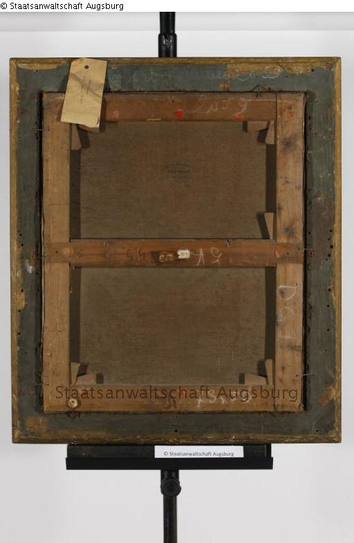 verso, Rahmen, weiße kreide, oben mittige: “Robert-Gu[...] 2059”, “2059”; Mitte: “5V”; unten rechts: “DGJ”, “73 x 50”; in rot, oben rechts: “Dr G.”; in blau, mittig: “5834”; unten links: “X”; mittig in schwarz: “5/5”, “6”; in rot auf mittigem Aufkleber: “327”; in schwarz auf Aufkleber unten links: “Bne de Gaujal / 431 / [unleserlich]; unten links: “D.W.29[4?]83”
