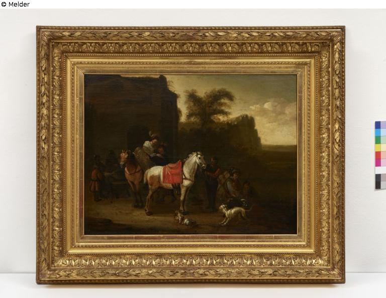 Auf der Bildrückseite mittig befinden sich drei Aufkleber: "Schlafzimmer 3" (handschriftlich), "Pieter van Laer, geb. zu Landen bei Norden 1613-1647. 66) Rückkehr von der Jagd. Vor dem Stallgebäude links Cavalier und Dame umgeben von Dienern und ihren Hunden, von der Jagd zurückgekehrt von ihren Pferden steigend. Holz. Höhe 49, Breite 65 Cent.", "Dyck 63/2" (handschriftlich); Handschriftlich auf Rahmen "G. Oeder[...]", "2006", Aufkleber von "Doreur Encadreur de S.A.R.M. gr le Comte de Flandre, J.F. Laudeick, Rue Neuve S. Gudule, 9, prés la Banque Nationale Bruxelles"