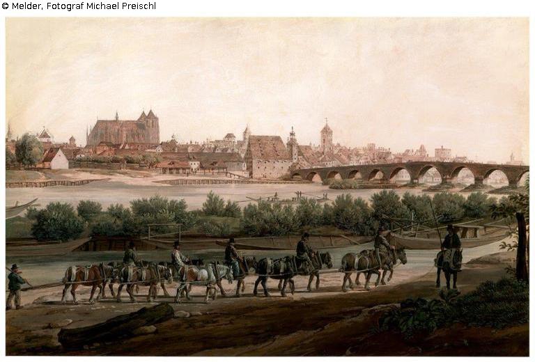 Blick von jenseits der Donau gegen Südwesten auf die Stadt im Abendlicht, dargestellt ab Niedermünster im Osten bis St. Oswald im Westen. In der rechten Bildhälfte die weit gespannte, vom Rand beschnittene Steinerne Brücke, links dominant der Dom. Im Vordergrund bewachsene Sandbank, davor Seitenarm mit Kähnen. Am diesseitigen Ufer Salzzuggespann mit berittenen Treibern.