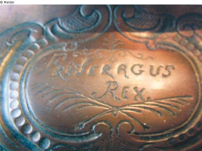 Auf dem Sockel ist die Inschrift "FRIDERRGUS REX" eingraviert. Die Inschrift erfolgte in falscher Namensschreibweise.