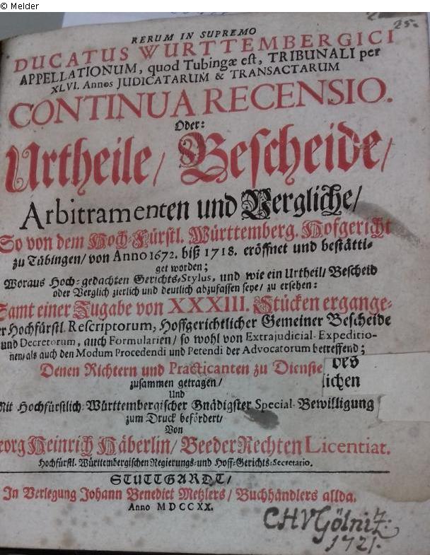 Rerum in supremo ducatus Wurttembergici appellationum, quod Tubingae est, tribunali per XLVI annos iudicatarum et transactarum continua recensio oder: Urtheile, Bescheide, Arbitramenten und Vergleiche