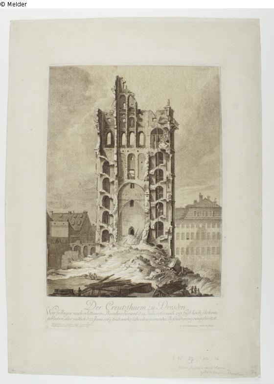 Ruine des Turms der nach der preußischen Beschießung 1760 eingestürzten alten Kreuzkirche am Altmarkt in Dresden