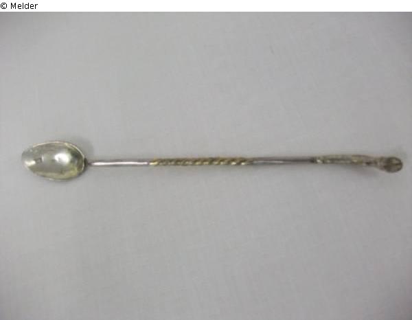 Kleiner eiförmiger Löffel, glatt angesetzt stabförmiger Stiel, in der Mitte in Spirale gedreht, das obere Ende als Wildschweinklaue gebildet. Meistermarke, Steuerstempel 1809.