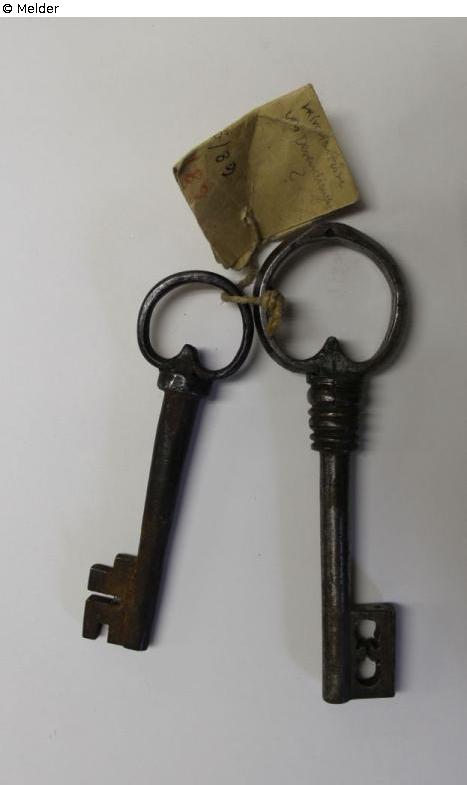 Zwei Eisenschlüssel (groß und klein) mit großem, herzförmigen Ring. Der große Schlüssel hat unterhalb des Rings einen sechsfach profilierten Schaft, der Bart mit zwei Löchern. Der kleine Schlüssel hat ein breites Band unterhalb des Rings und einen einfachen Bart.