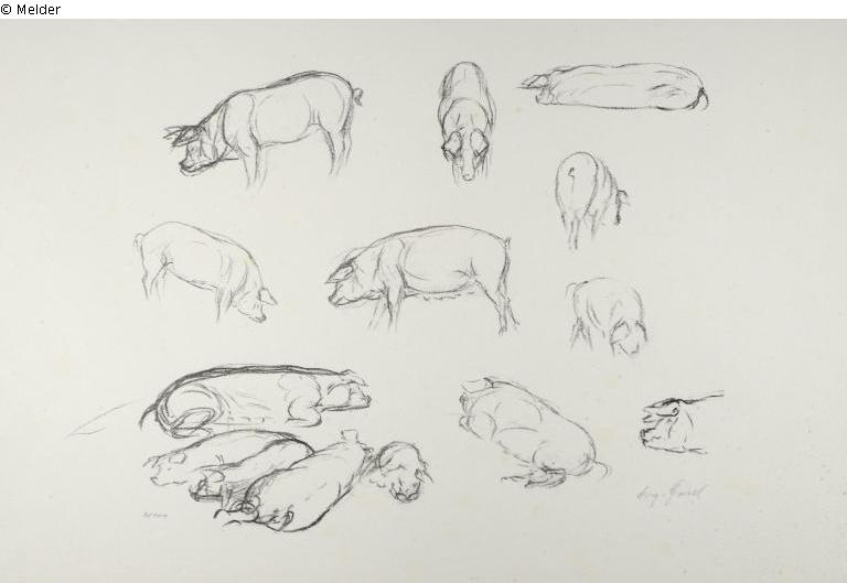 Nummerierung links unten: 2/100. Mit Bleistift bez. rechts unten: "Aug. Gaul". Bleistiftvermerk "Schweinestudien breit" links unten im Eck auf der Blattrückseite. Ohne Passepartout.