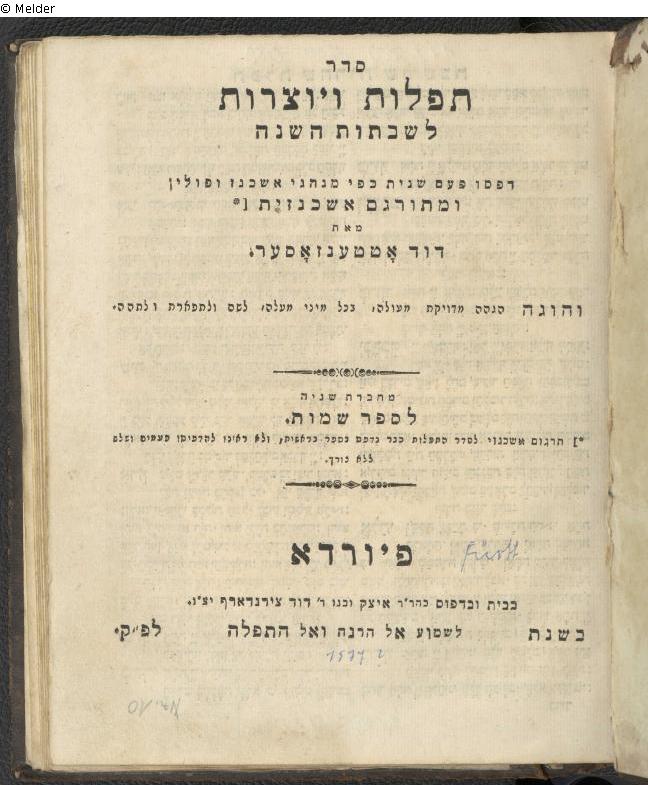 Fundmeldung | Einzelobjekt Seder tefilot ṿe-Yotserot le-Shabatot ha-shanah: ... ke-fi minhage Ashkenaz u-Polin nidpesu paʿam shenit Lost Art-ID612436 Vorherige Weiter Autor:in Ottensosser, David Lebensdaten1784 - 1858 Herausgeber Zürndorfer, David Isaac Verlag Tsirndorf TitelSeder tefilot ṿe-Yotserot le-Shabatot ha-shanah: ... ke-fi minhage Ashkenaz u-PolinZusatztitelnidpesu paʿam shenitErscheinungsortFiyorda Erscheinungsdatum1824 = 584 [jüd. Zeit]ObjektartBuchObjektgruppeBibliotheksgutSignatur04/1 Sulz 49Beschreibung Text hebr. u. jidd.; - Erscheinungsjahr nach einem ChronogrammWeitere Informationen: Externer Link Weiterlesen Weniger anzeigen Provenienz Heinrich Meißner (1914-2001), Pfarrer in Sulzbürg 1944-1984Andreas Bauch (1908-1985)Verdacht auf NS-RaubgutEichstätt, Priesterseminar, erworben 1985 durch SchenkungProvenienz Meißner/Bauch durch Schenkungszusammenhang belegt. Weiterlesen Weniger anzeigen Veröffentlicht seit01.03.2023 Kontakt Universitätsbibliothek Eichstätt-Ingolstadt Am Hofgarten 1 85072 Eichstätt Deutschland Homepagehttps://www.ku.de/bibliothek Ansprechpartner:in Dr. Heike Riedel-BierschwaleE-Mailub-historische-bestaende@ku.de