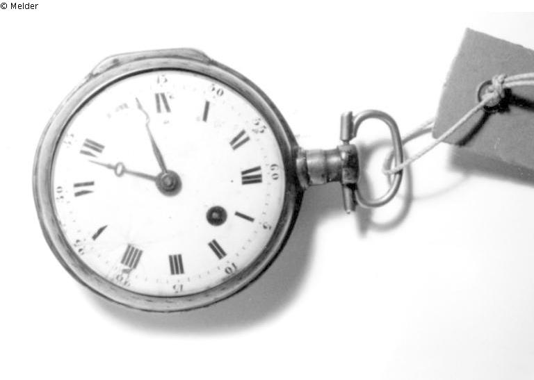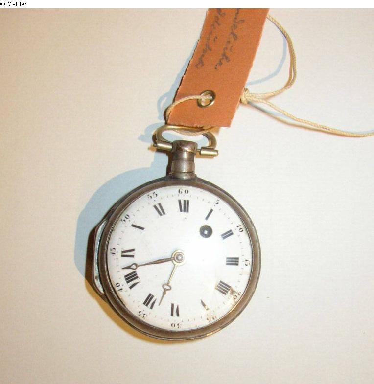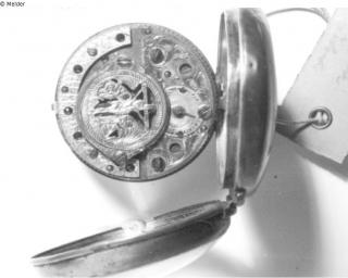 Spindeltaschenuhr. Glattes Silbergehäuse. Weißes Emailleziffernblatt mit römischen schwarzen Ziffern. Minuterie in arabischen Ziffern. Auf der Werksplatine Avance-Retard Angabe. Oberhalb einer bogenförmigen Anbringung von fünf roten Lagersteinen befindet sich in silber die Darstellung einer Kreuzigungsszene. Das Kreuz trägt die Punzierung FFD. Herstellungsort: Süddeutschland