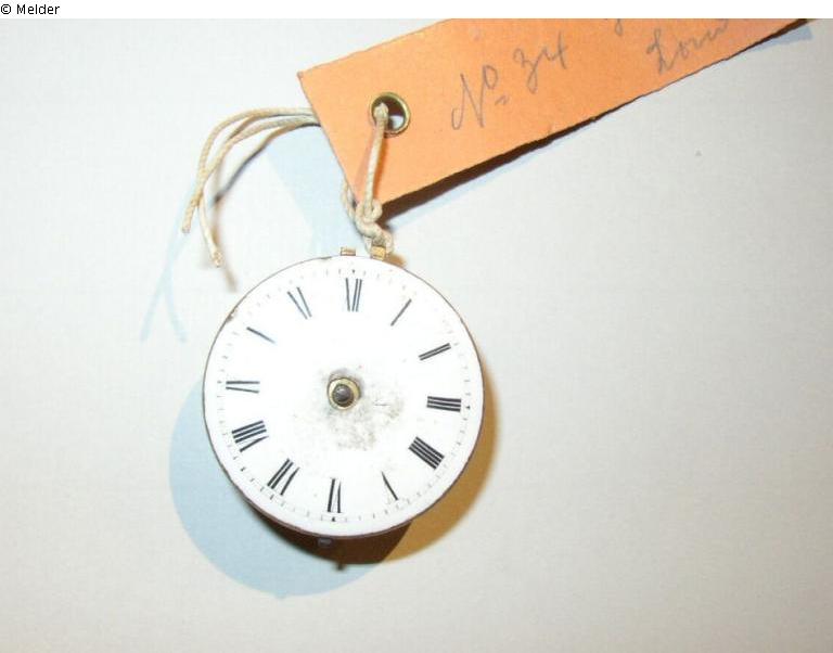 Uhrwerk mit noch einem Zeiger. Emailleziffernblatt mit römischen Ziffern und arkadenförmiger Minuterie mit arabischen Ziffern. Werksnummer 11242. Regulierscheibe mit Skala. Herstellungsort: London