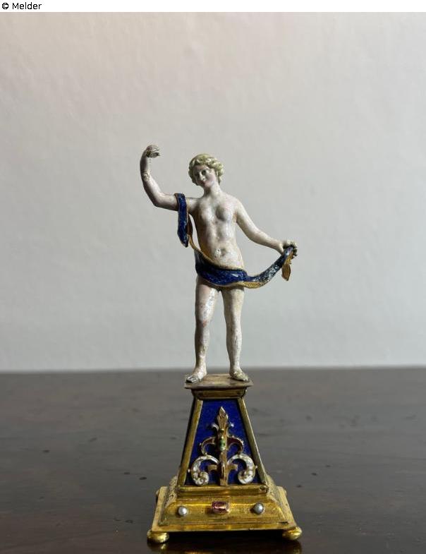 Emaillierte Venus-Statuette auf Vermeil-gefaßtem, ornamentierten und mit Perlen und Rubin verziertem Lapislazuli-Postament. Standfläche: Reste einer Ziffernfolge in Rot.