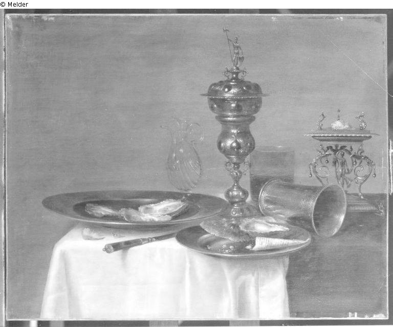 Stilleben mit Prunkpokal, Austern, Becher