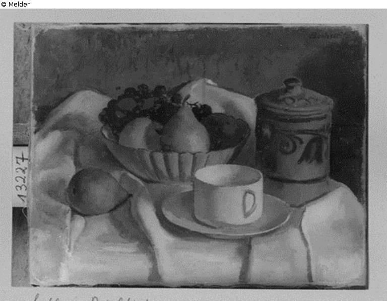 Fundmeldung | Einzelobjekt Stilleben mit Tasse Lost Art-ID569442 Vorherige Weiter Hersteller/Künstler:in Bechstein, Lothar Geburt 1884.08.18, Solothurn Tod 1936.11.28, München TitelStilleben mit TasseObjektartGemäldeObjektgruppeMalereiMaterial / TechnikÖl ; Leinwand / gemalt Höhe 37,00 cm Breite 45,00 cm InventarnummerMü. 13227; 80006098Beschreibung Auf einem faltigen Tischtuch eine Tasse, Obstschale mit Obst eine Dose mit Deckel und Knopf. Neben der Obstschale eine Birne. Weiterlesen Weniger anzeigen Veröffentlicht seit29.09.2017 Kontakt Bundesamt für Auswärtige Angelegenheiten Kirchhofstraße 1-2 14776 Brandenburg Deutschland E-MailI-AU-RL@bfaa.bund.de