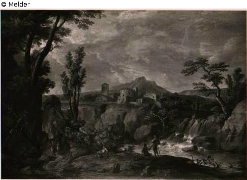 In der Mitte am Fluß ein stehender und ein sitzender Jüngling. Links ein sitzender Mann, im Hohlweg lins zwei Staffagefiguren.Der Wasserfall halb rechts, im Mittelgrund Häuser und Türme.