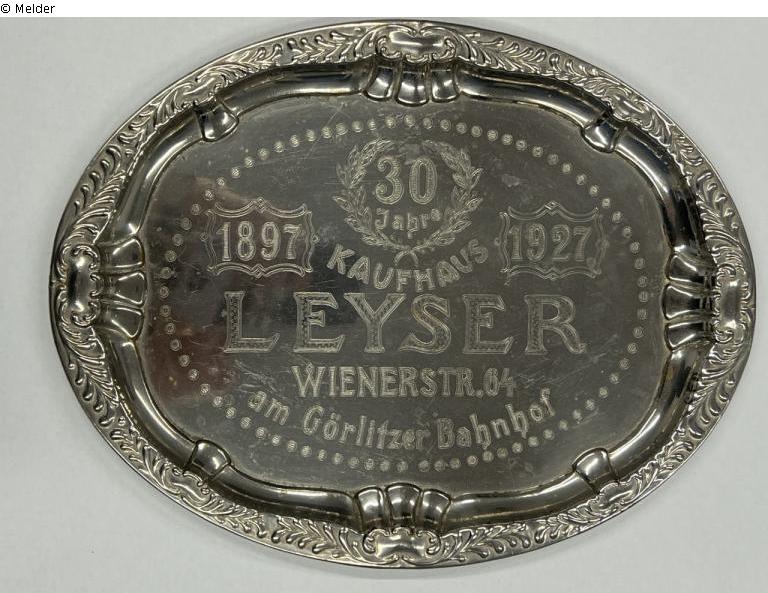 Tablett aus vernickeltem Stahlblech mit Verzierungen und Gravur: "30 Jahre/1897-1927/Kaufhaus Leyser- Wienerstraße 64/am Görlitzer Bahnhof"